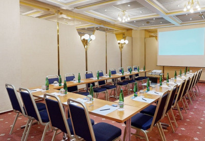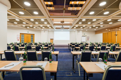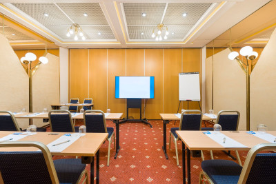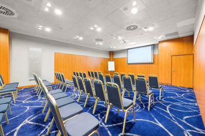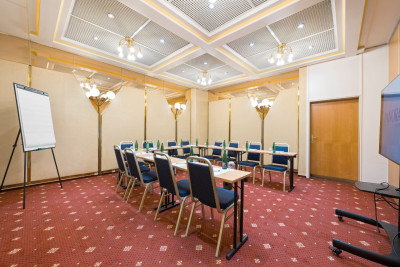 Kongresová místnost s klimatizací, denním světlem a protihlukovými okny v přízemí hotelu.